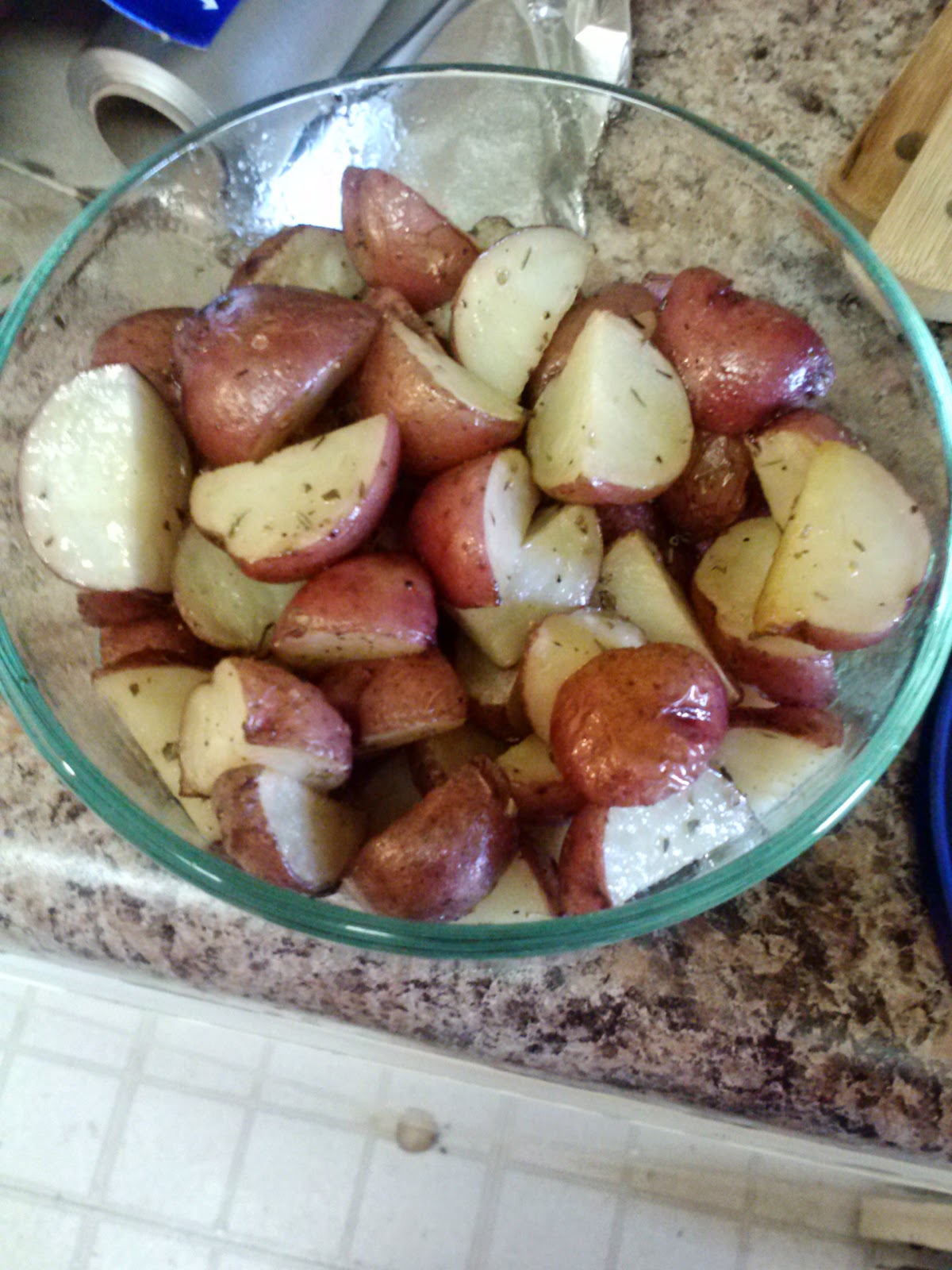 | These are amazing and SO simple! Just chop up small red potatoes, mix them in a bowl with olive oil, rosemary, garlic, sea salt, and pepper, then bake at 450 until browning 🙂 |