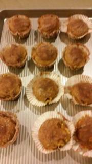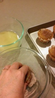 When finished baking, melt Earth Balance spread. Dip the top of each muffin into the melted butter and then into a bowl of sugar mixed with cinnamon.