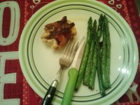 Just wrap the tilapia filets in a piece of bacon and place in a frying pan over medium heat…and voila! In about 15 minutes, you have a surprisingly delicious and flavorful entree. I threw in some asparagus on the side to balance out my plate and make it seem healthier. Also, notice the small portion size of tilapia: the rest is sealed away in the fridge and freezer for future meals 🙂