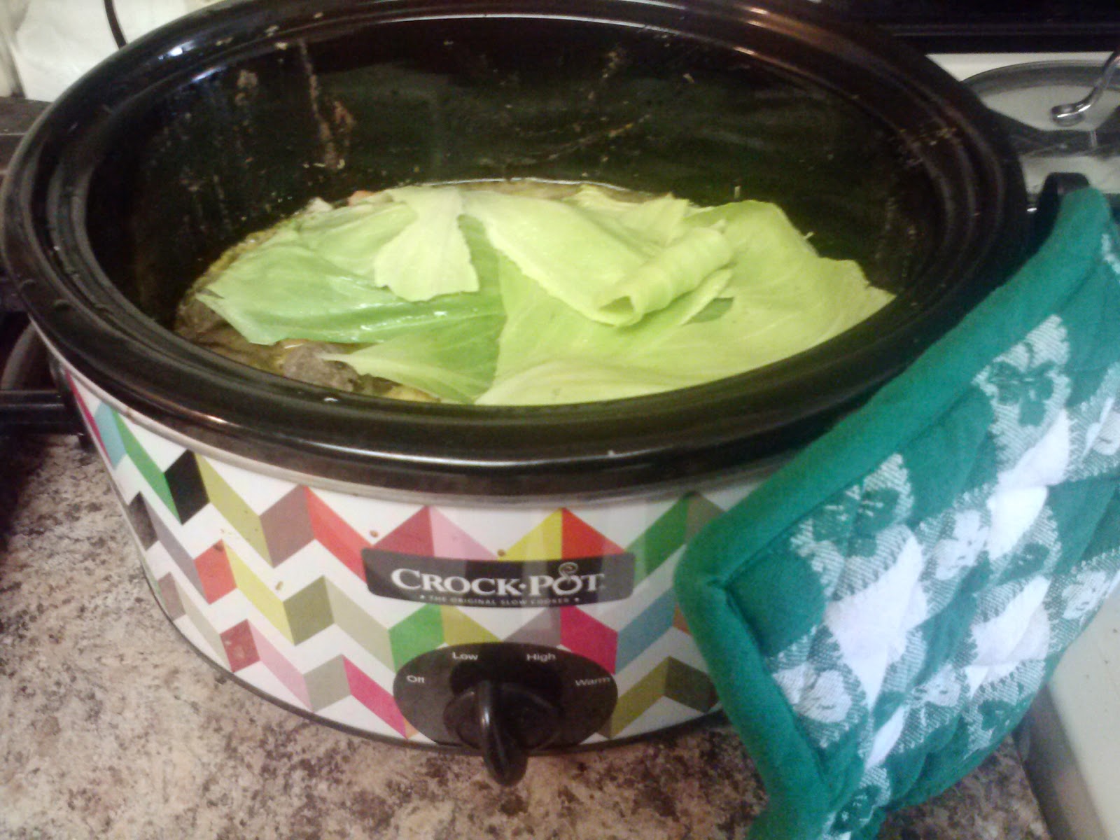 2) Mix all ingredients in the crockpot. Top off with the cabbage leaves and cook on low for 5-6 hours.