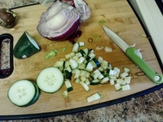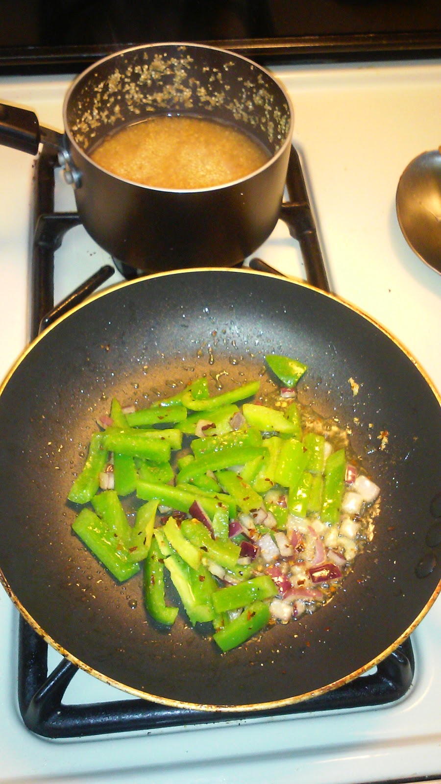 2. While the water/quinoa is boiling, cut up the pepper and onion. Then sautee with the seasonings until the vegetables are tender.