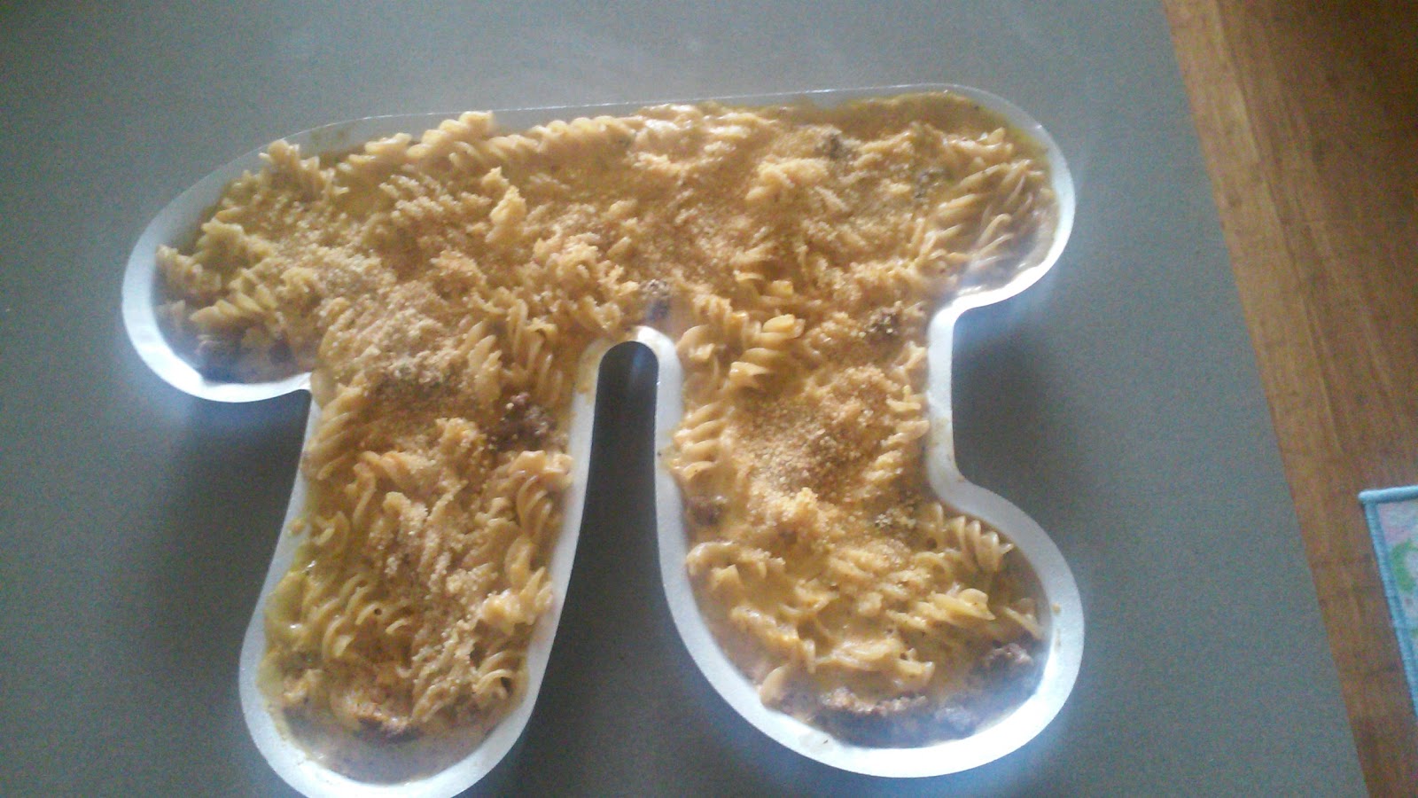 4. When the pasta is ready, mix the pasta with the cheese sauce and place in a casserole dish. (I chose to use the Pi dish sitting next to my casserole dish last night…because why not??)