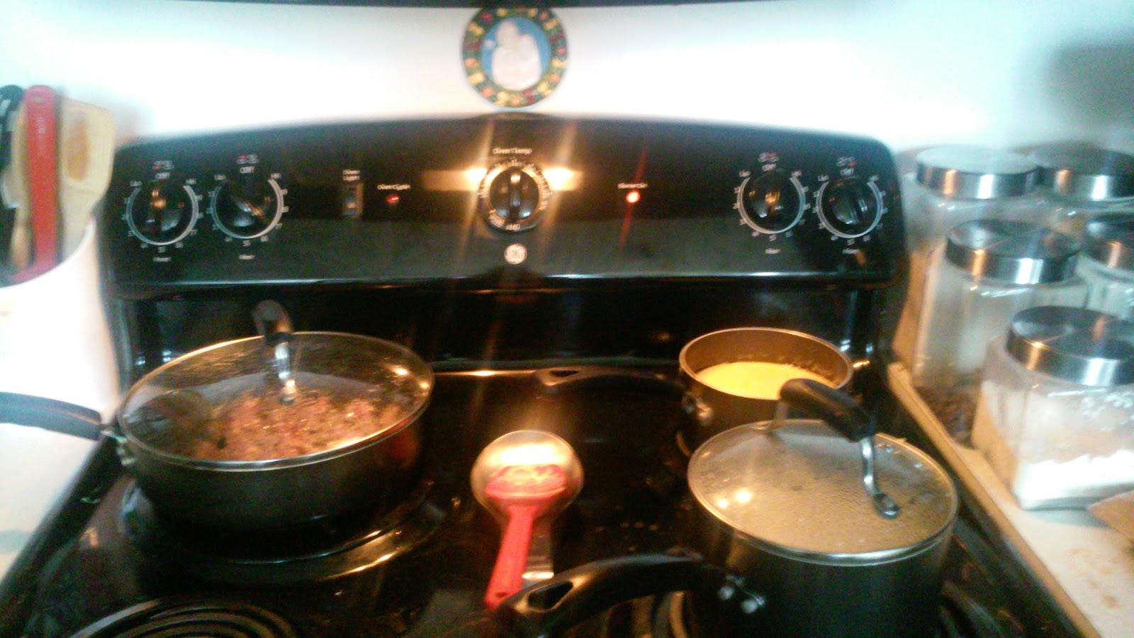 my own version of Hamburger Helper…hence the ground beef in that third pan.